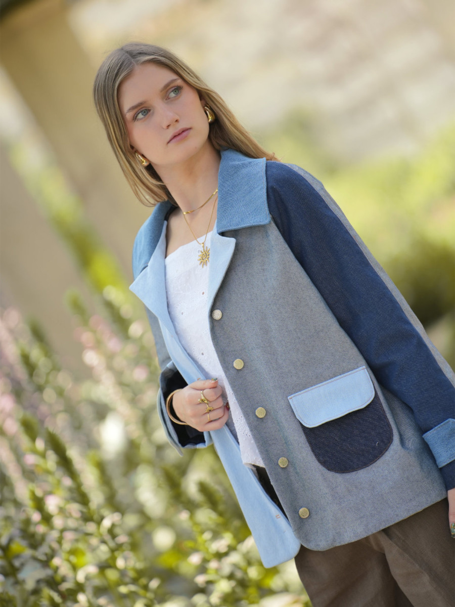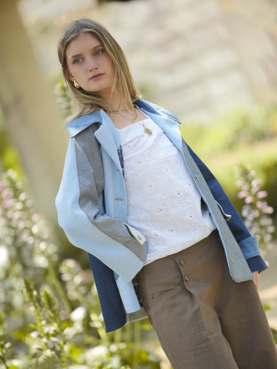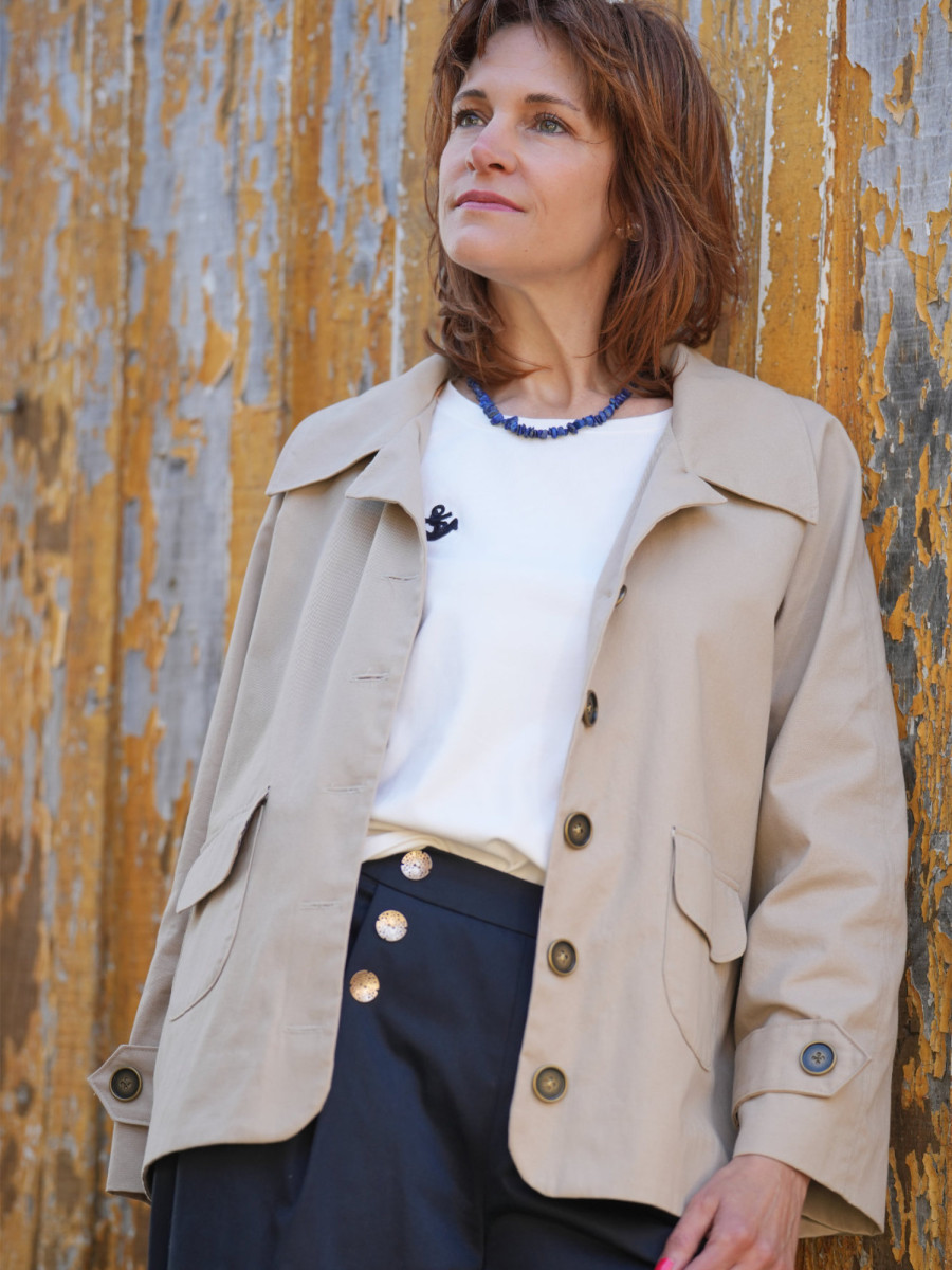 Il comporte d’une doublure flottante, d’un col classique style tailleur et de poches arrondies plaquées sur le devant.
