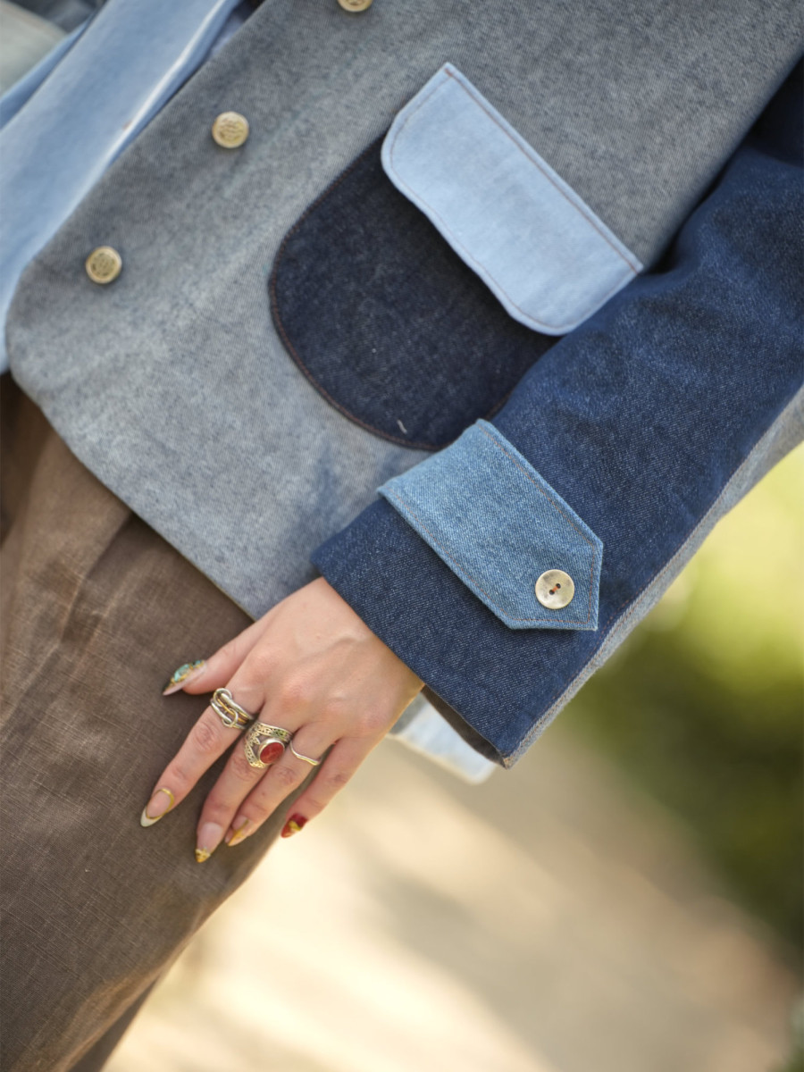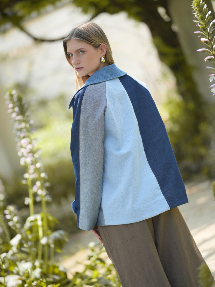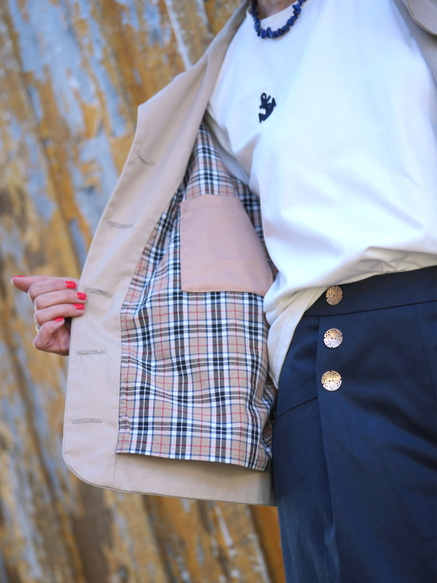 Il comporte d’une doublure flottante, d’un col classique style tailleur et de poches arrondies plaquées sur le devant.