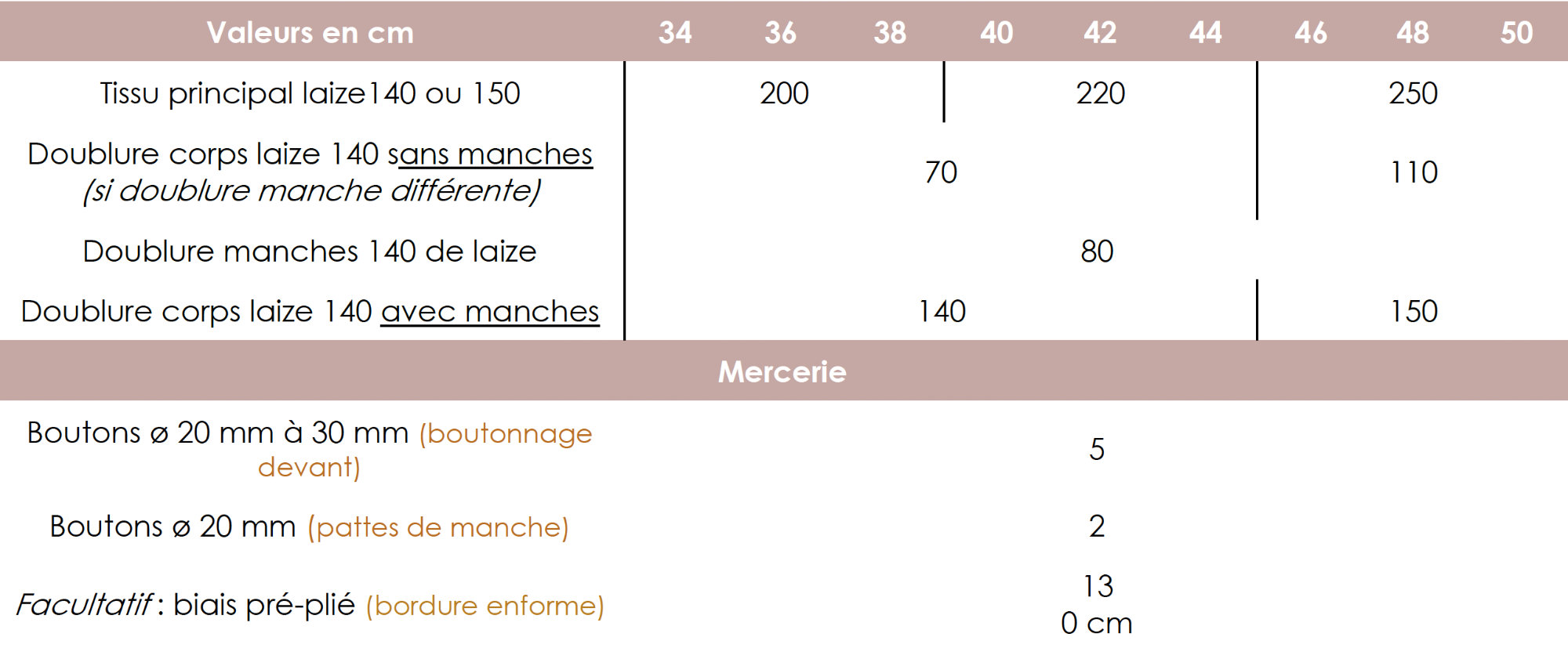 Les métrages ci-dessous sont calculés pour optimiser un maximum le placement des pièces de manière à économiser la matière nécessaire. Si vous souhaitez utiliser un tissu avec un motif à raccords, il vous faudra sans doute prévoir d’avantage de métrage.