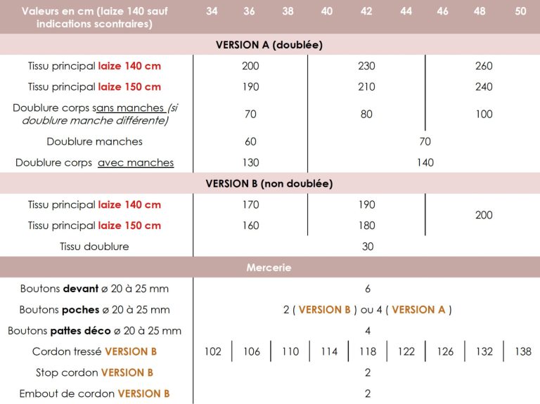 Les métrages ci-dessous sont calculés pour optimiser un maximum le placement des pièces, de manière à économiser la matière nécessaire. Si vous souhaitez utiliser un tissu avec un motif à raccords, il vous faudra prévoir davantage de métrage.
