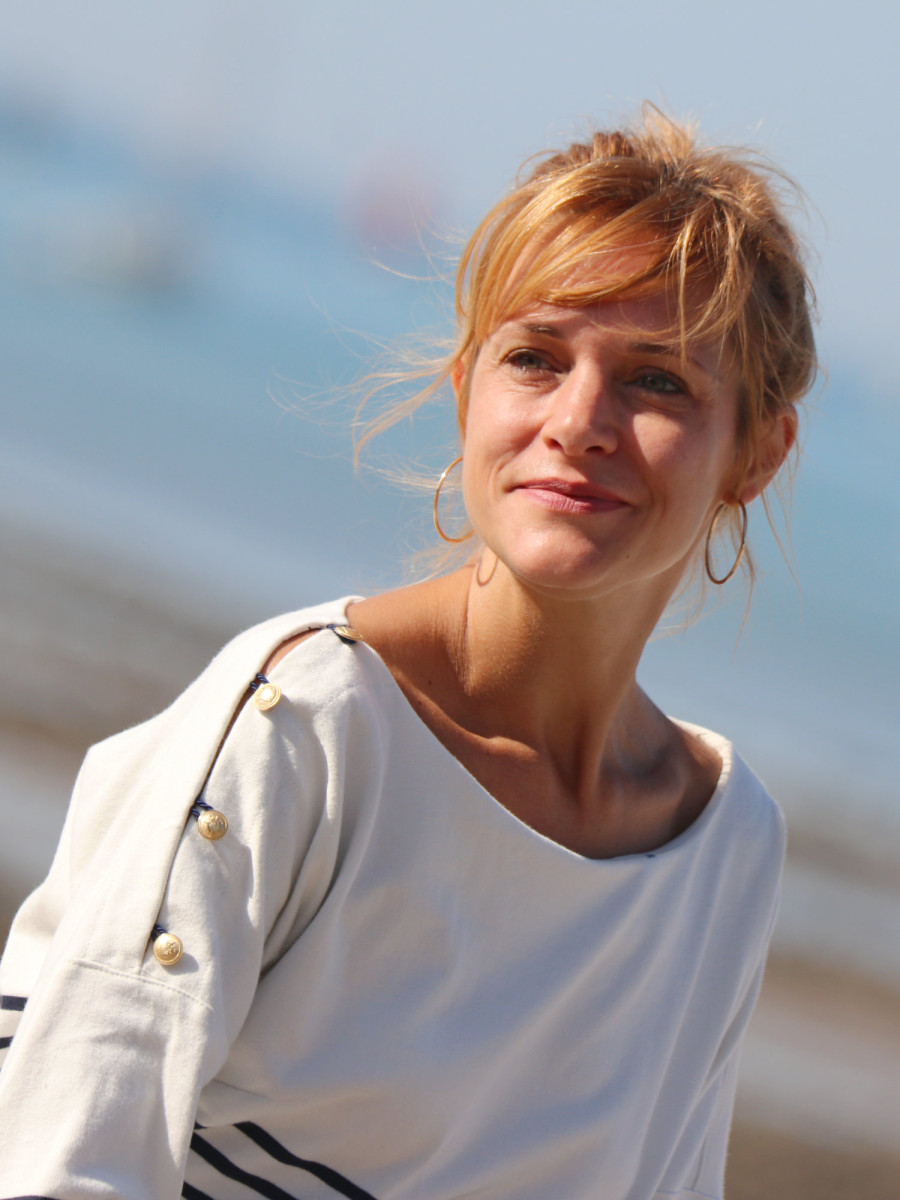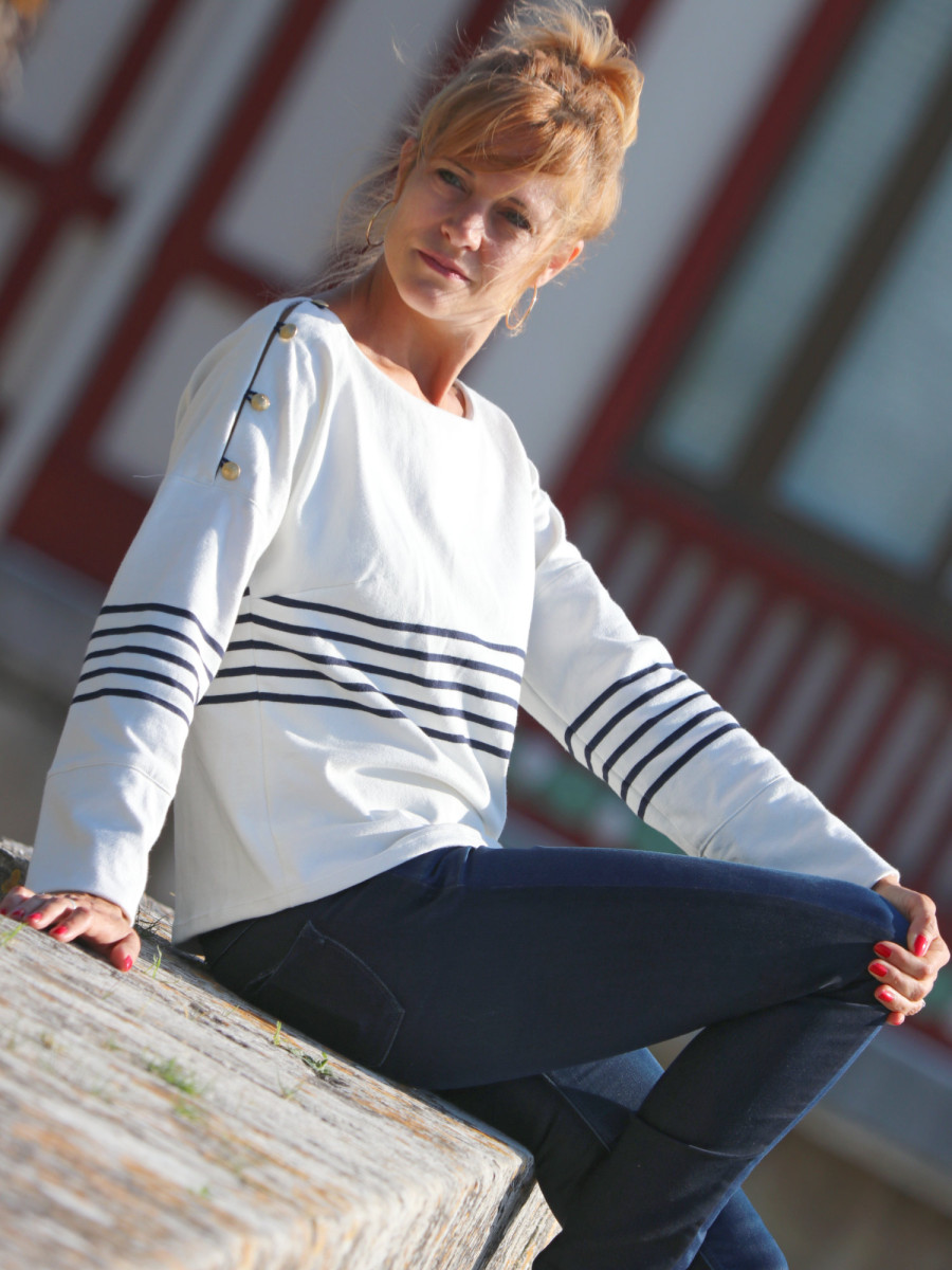 VERSION A : encolure bateau échancrée, boutonnage épaule, manches droites, poignets longs boutonnés. Elle peut être cousue avec col (col chemise, ouvert sur le boutonnage de l’épaule droite), ou sans col, avec parementure.