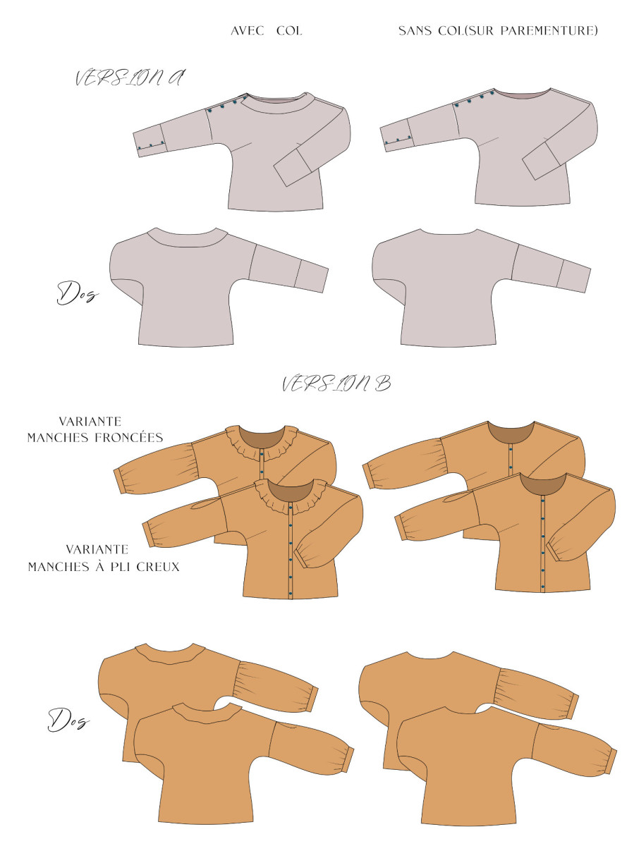 Vous pouvez bien sûr imaginer d’autres combinaisons, avec les manches notamment : les manches froncées de la VERSION B peuvent être montées sur la VERSION A et vice versa.