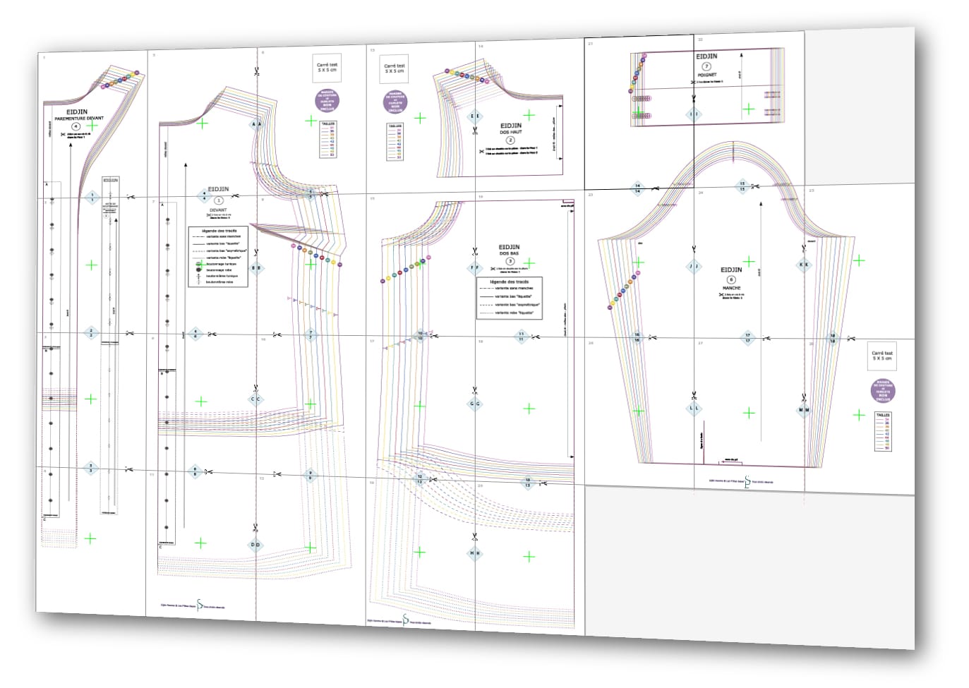 1. La(les) planche(s) du patron TAILLE REELLE, marges de couture NON INCLUSES ET/OU INCLUSE (info à vérifier dans chaque fiche produit) Celle-ci se présente sous la forme d’une succession de pages A4 à imprimer chez soi, puis à assembler selon un plan de montage précisé dans les instructions.